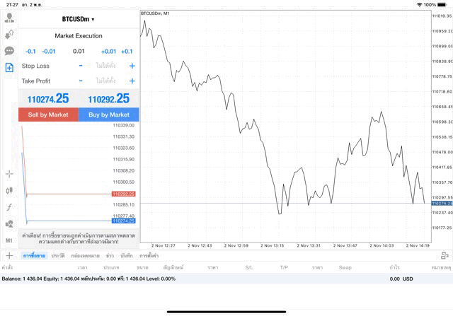 กรอกจำนวน lot ที่นักลงทุนต้องการลงทุน เช่น 0.01 lot คลิ๊กปุ่ม Buy by market หรือ Sell by market